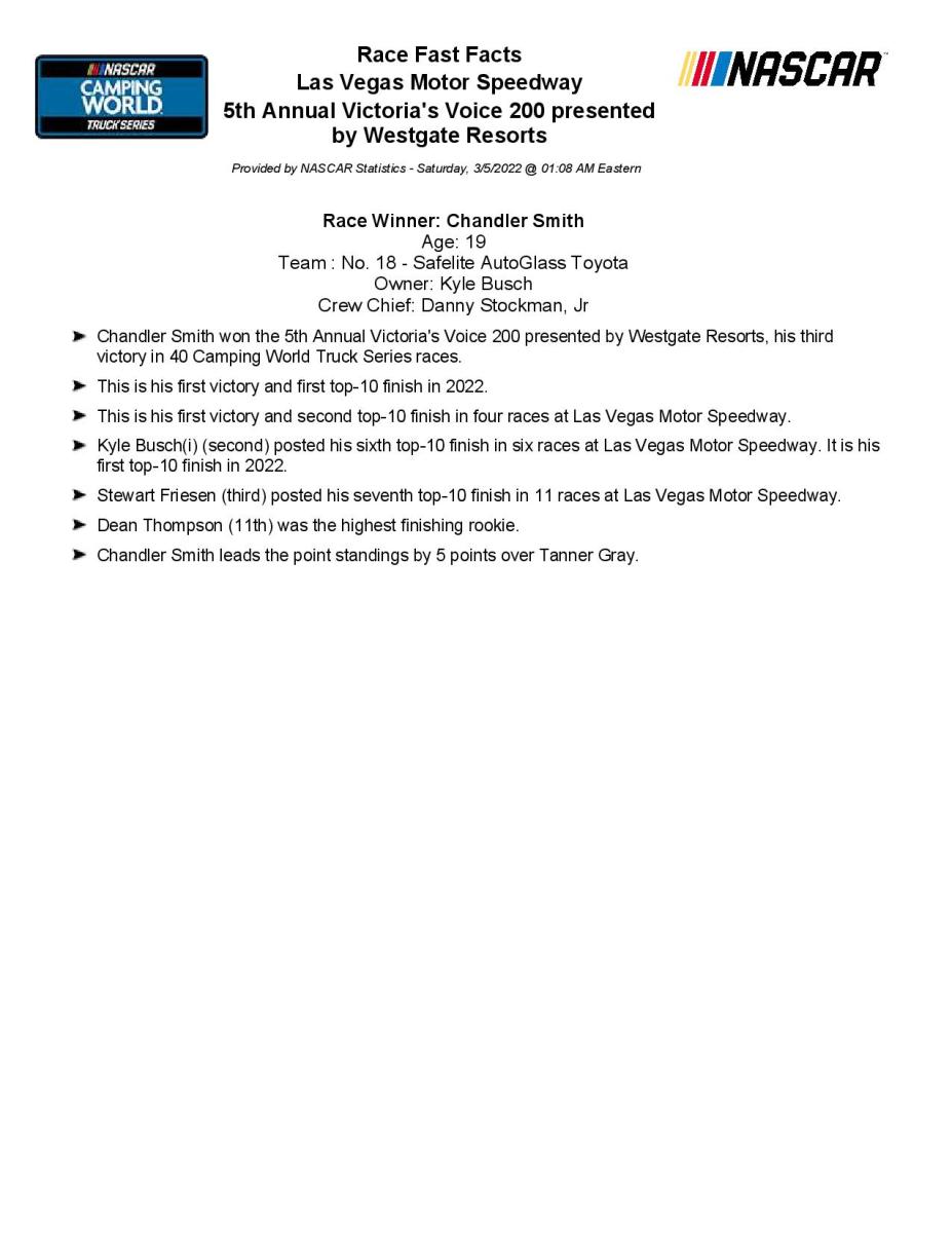 Mar 5 2022 511 AM. Find the most up-to-date results for NASCAR Truck as well as results and standings from previous seasons. Chandler Smith wins Chandler Smith was victorious after a chaotic NASCAR Truck Series race at Las Vegas Motor Speedway.